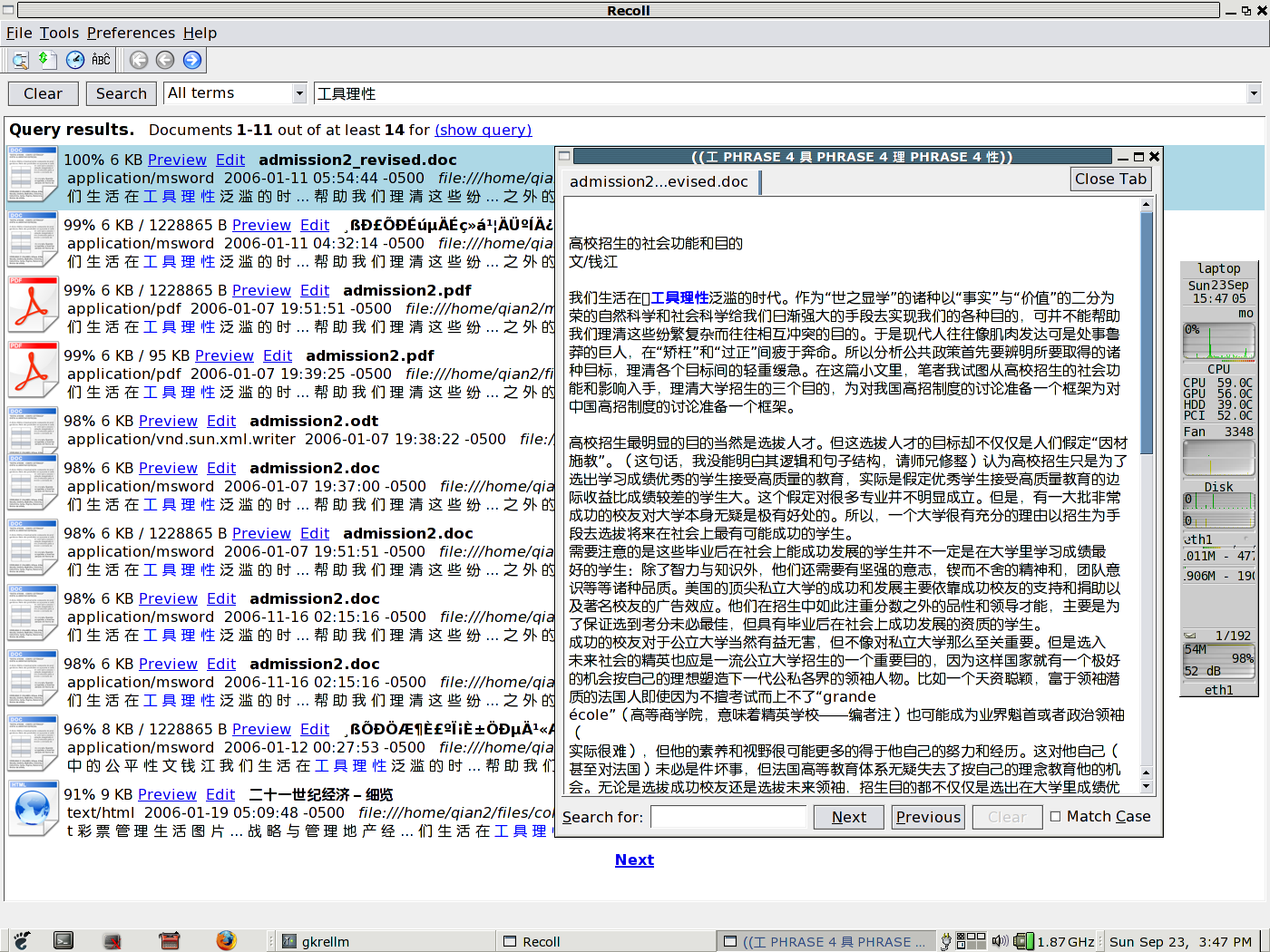 Recoll searching Chinese text. Chinese text search is based on n-grams and relatively rough, but still useful (I am told).