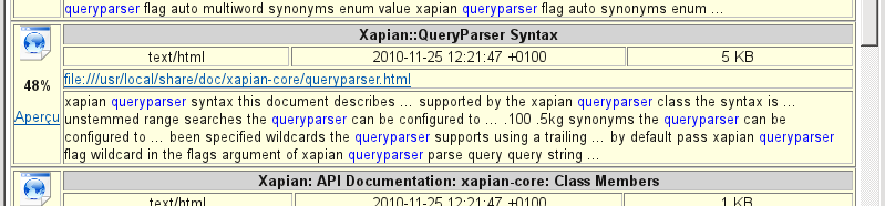 The Recoll result list is actually made of html text displayed inside a Qt Widget. In all Recoll versions, you can specify the format for the list entries: what data is displayed for each hit document and how. This used to include "almost full" support for HTML capabilities, with a few restrictions due to the Qt QTextBrowser object.